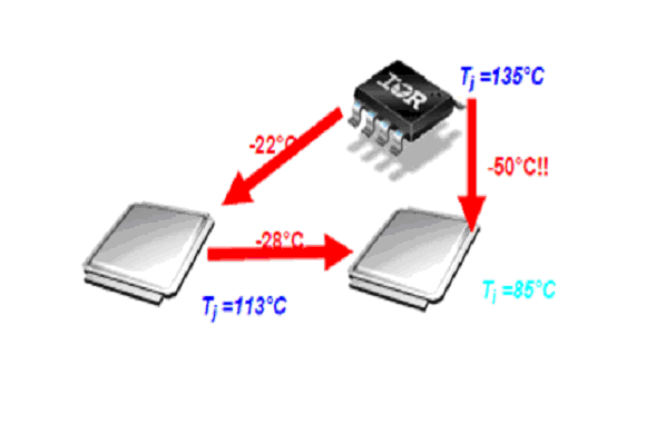 以一個(gè)每相30A的多相變換器為例,要滿足這個(gè)電流,用最好的單面散熱的SO8封裝MOSFET,比如標(biāo)準(zhǔn)的SO-8,無底的SO-8和無鉛的SO-8,每相要用五只,而雙面散熱的DirectFET 只需兩只。比較結(jié)果元件數(shù)減少了60%。