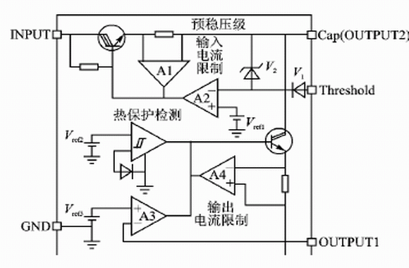 從圖1中還可以看出,VB409還有輸入、輸出電流的限制和熱保護(hù)功能。其作用在于:一方面當(dāng)輸出短路時(shí)限制電流的輸出;另一方面當(dāng)過(guò)載時(shí)關(guān)斷芯片。