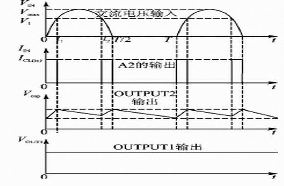 VB409采取的是導(dǎo)通角技術(shù),即在交流電的一個(gè)周期中,根據(jù)負(fù)載的電流大小,自動(dòng)調(diào)整每個(gè)周期的導(dǎo)通時(shí)間。也就是說(shuō),只在每個(gè)正周期的低壓部分,從電源吸收電能,因此極大地降低了功耗,電流輸出能力是線性電源的3倍。其工作波形如圖2所示。
