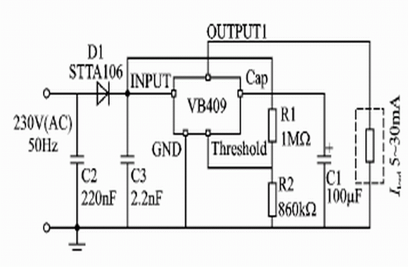 在小型的MCU應(yīng)用系統(tǒng)中,采用AC 220V供電時(shí),一般要使用變壓器對(duì)電源進(jìn)行處理,將高壓交流電降到低壓后再進(jìn)行直流處理,或者將交流電變?yōu)楦邏褐绷麟姾笤龠M(jìn)行高頻變換,以得到MCU系統(tǒng)的工作電源。這對(duì)于結(jié)構(gòu)沒(méi)有特殊要求的系統(tǒng),在設(shè)計(jì)上屬于常規(guī)的問(wèn)題,使用上述的線性電源技術(shù)或者開(kāi)關(guān)電源技術(shù),均能得到方便的解決。但是有些MCU應(yīng)用系統(tǒng)在體積上要求極其小巧,甚至不能安放變壓器,所以常規(guī)的電源處理就不能滿(mǎn)足其要求了。因此,使用能夠直接接收高壓交流電并將其直接變換成低壓直流的技術(shù),是最佳的設(shè)計(jì)選擇。VB409的出現(xiàn)有望實(shí)現(xiàn)這一設(shè)計(jì)思路。