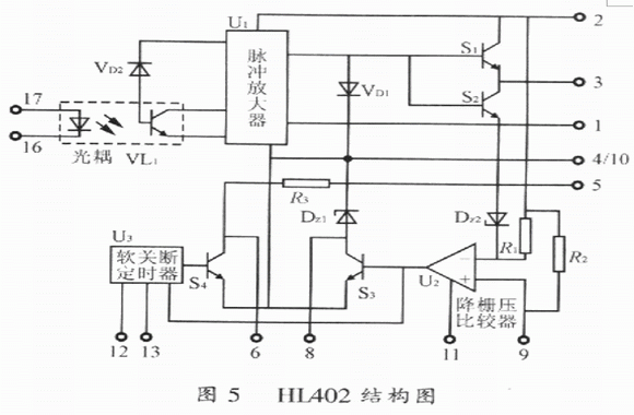 HL402結構圖如圖5所示。圖5中,VL1為帶靜電屏蔽的光耦合器,它用來實現與輸入信號的隔離。由于它具有靜電屏蔽,因而顯著提高了HL402抗共模干擾的能力。圖5中U1為脈沖放大器,S1、S2實現驅動脈沖功率放大,U2為降柵壓比較器,正常情況下由于腳9輸入的IGBT集電極電壓VCE不高于U2的基準電壓VREF,U2不翻轉,S3不導通,故從腳17和腳16輸入的驅動脈沖信號經S2整形后不被封鎖。該驅動脈沖經S2、S2放大后提供給IGBT使其導通或關斷,一旦IGBT退飽和,則腳9輸入集電極電壓給IGBT使其導通或關斷,并且腳9輸入的集電極電壓采樣信號VCE高于U2的基準電壓VREF,比較器U2翻轉輸出高電平,使S3導通,由穩壓管DZ2將驅動器輸出的柵極電壓VGE降低到10V。此時,軟關斷定時器U3在降柵壓比較器U2翻轉達到設定的時間后,輸出正電壓使S4導通,將柵極電壓軟關斷降到IGBT的柵射極門限電壓,給IGBT提供一個負的驅動電壓,保證IGBT可靠關斷。