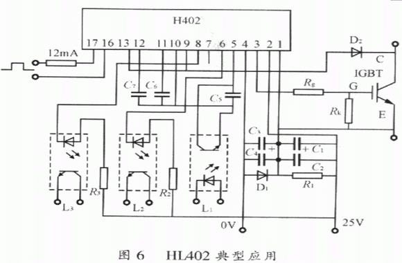 HL402典型應用圖如圖6所示。在實際電路中,C1、C2、C3、C4需盡可能地靠近H1402的腳2、腳l、腳4安裝。為了避免高頻耦合及電磁干擾,由HL402輸出到被驅動IGBT柵射極的引線需要采用雙絞線或同軸電纜屏蔽線,其引線長度不超過1m。腳9和腳13接至IGBT集電極的引線必須分開走,不得與柵極和發射極引線絞合,以免引起交叉干擾。光耦合器L1可輸入脈沖封鎖信號,當L1導通時,HLA02輸出脈沖立即被封鎖至-10V。光耦合器L2提供軟關斷報警信號,它在軀動器軟關斷的同時導通光耦合器L3,提供降柵壓報警信號。使用中,通過調整電容器C5、C6、C7的值,可以將保護波形中的降柵壓延遲時間、降柵壓時間、軟關斷斜率時間調整至合適的值。在高頻應用時,為了避免IGBT受到多次過電流沖擊,可在光耦合器L2輸出數次或1次報警信號后,將輸入腳16和腳17間的信號封鎖。