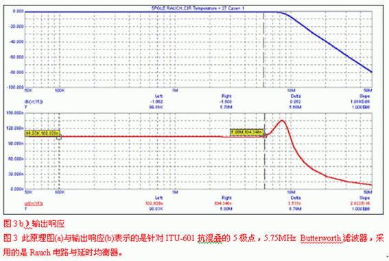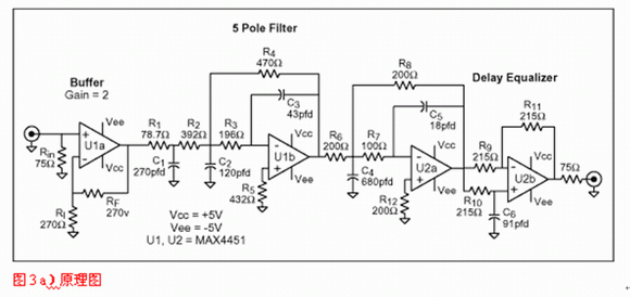 使用軟件或歸一化曲線,我們會發(fā)現(xiàn)-3dB帶寬為8.45MHz的5極點Butterworth濾波器就能滿足選擇性要求,但沒考慮群延時。對于后者,需要一個延時級,對于此電路,需要重點關(guān)注的運放參數(shù)為0.1dB,2VP-P帶寬。將該數(shù)值應(yīng)用于式1和2可獲得精確的設(shè)計。圖3a與3b給出了一個適合此類應(yīng)用的原理圖,并用曲線顯示了它的增益和群延時特性,此設(shè)計基于四倍過采樣系統(tǒng)。由于MAX4450/4451卓越的瞬態(tài)響應(yīng)與大信號帶寬(2VP-P時175MHz),因此選擇它。