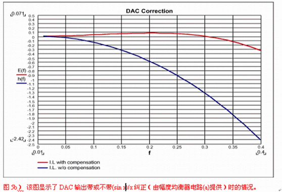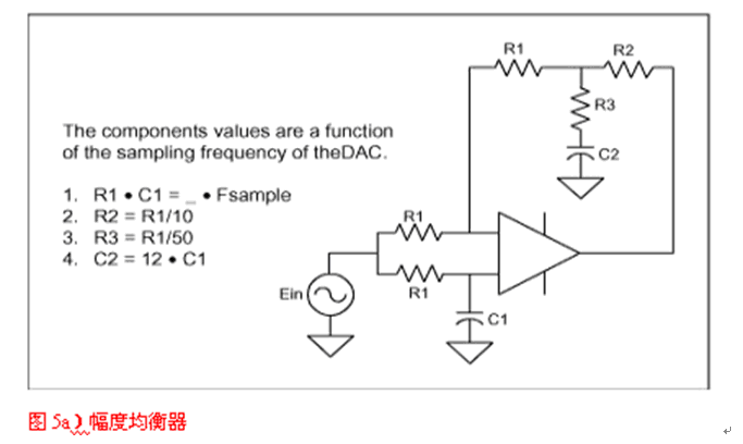 DAC之后的重建濾波是沒有被很好理解的應(yīng)用之一。很多設(shè)計者認為引入重建濾波器是為了濾掉采樣時鐘,但這遠不是事實。當信號被采樣時,采樣中包含了多個重復的信號映像,分別對準采樣時鐘的各次諧波。重建濾波器將濾掉除基帶采樣外的所有其他信號。如果抗混疊濾波器達到了其目的,那么DAC輸出看上去就像圖4中的映像A,接下來,它右邊的所有采樣都應(yīng)被濾掉。因此,對于重建的要求類似于抗混疊,但是,由于每個采樣只停留瞬間,DAC會將每個采樣保持一個時鐘周期,這樣一來,就產(chǎn)生了我們所熟悉的逼近于某斜線的臺階狀波形。保持功能相當于一個數(shù)字濾波器,它的特性類似于Butterworth或Bessel濾波器,在半采樣頻率處響應(yīng)被降低了4dB。重建濾波器的第二個目的是補償這個損失,這就需要如圖5a電路那樣的幅度均衡器。該均衡器在一個延時電路的基礎(chǔ)上構(gòu)成,具有類似于Bessel濾波器的響應(yīng)。它可按照DAC采樣率(FS)來設(shè)計。圖5b顯示了采用和未用幅度均衡器時的DAC頻率響應(yīng)。與延時級類似,它可以被包含在任何重建濾波器中。