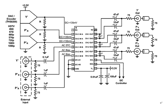 AC偏置非常簡單。THS73x3有兩個電阻,其可在電源和接地間創(chuàng)建分壓器。該模式的輸入阻抗為20kΩ,因此所用的電容應(yīng)足夠大,以盡可能減小傾斜或下垂問題。該模式最適用于Chroma或色差信號,也可用于Luma信號、G’B’R’信號或計算機的R’G’B’信號。由于信號為AC耦合,且DC偏置點與平均信號電平有差異,因此對于帶5V電源同步信息的信號而言,我們最好用AC偏置模式,以確保沒有剪切問題發(fā)生。
