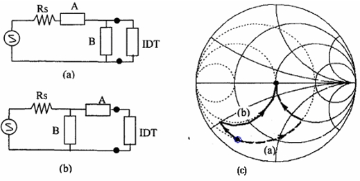 圖 1 二種簡單匹配電路方案(a)、(b) 及對應的Smith 圓圖路徑(c)