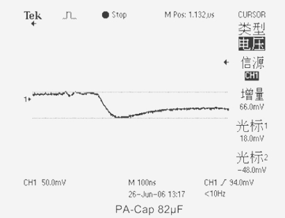 5、當測試電容采用(PA-Cap)聚合物片式疊層鋁電解電容器CT=82μF ESR=13mΩ時,輸出電壓下跌值僅為66mV。