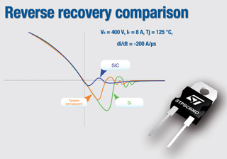 電源開關使用的普通硅二極管因為無法立即關斷而導致電源能效損失1%。意法半導體率先推出可在開關操作中降低能耗的碳化硅(SiC)二極管。