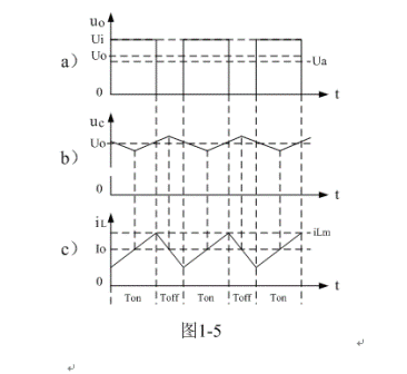 (3)當(dāng)Ui < 2Uo時(shí),即:濾波輸出電壓Uo大于電源輸入電壓Ui的一半時(shí),或控制開(kāi)關(guān)K的占空比大于二分之一時(shí):在K接通期間,雖然流過(guò)儲(chǔ)能電感L的電流上升率(絕對(duì)值),小于,在K關(guān)斷期間,流過(guò)儲(chǔ)能電感L的電流上升率(絕對(duì)值)。但由于Ton大于Toff,(1-5)式中i(0)和(1-11)式中iLX均大于0,即:電感存儲(chǔ)能量每次均釋放不完。在這種情況下,流過(guò)儲(chǔ)能電感L的電流iL是連續(xù)電流,開(kāi)關(guān)電源工作于連續(xù)電流狀態(tài),輸出電壓Uo的紋波比較小,且濾波輸出電壓Uo大于濾波輸入電壓uo的平均值Ua。參看圖1-5。