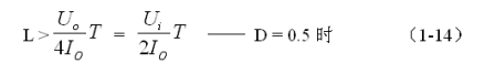 (1-13)和(1-14)式,就是計算串聯(lián)式開關(guān)電源儲能濾波電感L的公式(D = 0.5時)。(1-13)和(1-14)式的計算結(jié)果,只給出了計算串聯(lián)式開關(guān)電源儲能濾波電感L的中間值,或平均值,對于極端情況可以在平均值的計算結(jié)果上再乘以一個大于1的系數(shù)。