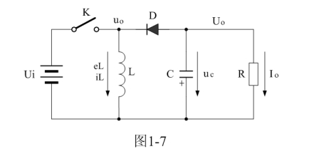 圖1-7中,Ui為輸入電源,K為控制開關,L為儲能電感,D為整流二極管,C為儲能濾波電容,R為負載電阻。當控制開關K接通的時候,輸入電源Ui開始對儲能電感L加電,流過儲能電感L的電流開始增加,同時電流在儲能電感中也要產生磁場;當控制開關K由接通轉為關斷的時候,儲能電感會產生反電動勢,使電流繼續流動,并通過整流二極管D進行整流,再經電容儲能濾波,然后向負載R提供電流輸出。控制開關K不斷地反復接通和關斷過程,在負載R上就可以得到一個負極性的電壓輸出。
