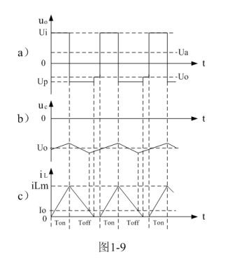 反轉式串聯開關電源輸出電壓一般為負脈沖的幅值。當開關電源工作于臨界連續電流狀態時,流過儲能電感的初始電流i(0)等于0(參看圖1-8-a)),即:(1-26)式中流過儲能電感電流的最小值iLX等于0。因此,由(1-21)和(1-26)式,可求得反轉式串聯開關電源輸出電壓Uo為: