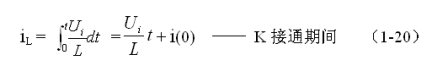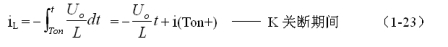 式中–Uo前的負號,表示K關斷期間電感產生電動勢的方向與K接通期間電感產生電動勢的方向正好相反。對(1-22)式進行積分得: