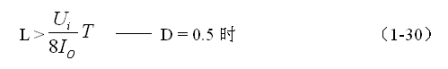 (1-29)和(1-30)式,就是計算反轉式串聯開關電源中儲能電感的公式。同理,(1-29)和(1-30)式的計算結果,只給出了計算反轉式串聯開關電源儲能濾波電感L的中間值,或平均值,對于極端情況可以在平均值的計算結果上再乘以一個大于1的系數。
