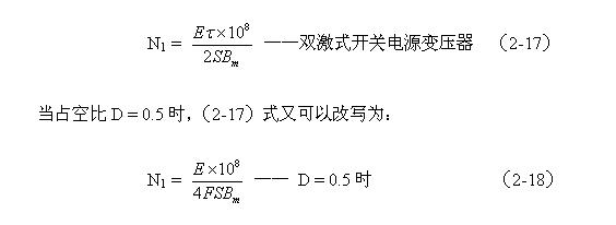 (2-18)式雖然是用于計算雙激式開關電源變壓器初級線圈N1繞組匝數的公式,但只需把式中的某個別參數稍微進行變換或修改,同樣可以用于計算其它波形電源變壓器初級線圈匝數的公式。