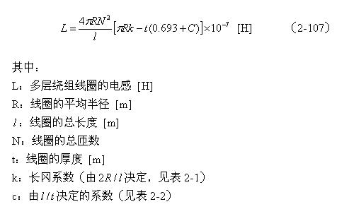 【說明】上式是用來計算多層線圈繞組、截面為圓形的空心線圈的電感計算公式。長岡系數k可查閱表2-1,系數c可查閱表2-2。當線圈內部有磁芯時,有磁芯線圈的電感是空心線圈電感的