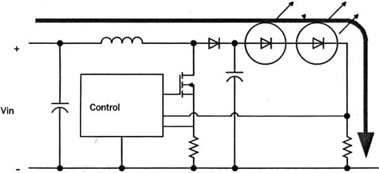 如果電源電壓低于所有LED串聯電壓和,就要選用升壓穩壓器。升壓穩壓器(圖3)既要控制電流,又要控制電壓,電路相對復雜些。升壓穩壓器在大電流情況下同樣存在嚴重的干擾問題。因而最穩定又最安全的LED驅動器可采用升壓與降壓相結合的形式。一個升壓穩壓器可驅動幾個并聯的降壓穩壓器。這樣,面對電源的是性能良好的升壓穩壓器,而在負載端則是高電流輸出的降壓穩壓器。