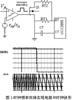 突降實(shí)現(xiàn)方法如圖3:以UCC3895為例,當(dāng)電源處于正常負(fù)載狀態(tài)時(shí),Q1導(dǎo)通,其時(shí)鐘周期為: