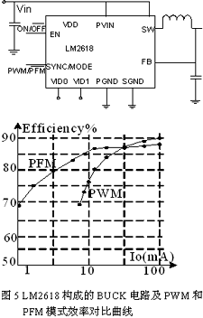 對(duì)于額定功率時(shí)工作在PWM模式的開關(guān)電源,,也可以通過切換至PFM模式提高待機(jī)效率,即固定開通時(shí)間,調(diào)節(jié)關(guān)斷時(shí)間,負(fù)載越低,關(guān)斷時(shí)間越長,工作頻率也越低。圖5是采用NS公司的LM2618控制的Buck轉(zhuǎn)換器電路和分別采用PWM和PFM控制方法的效率比較曲線。由圖可見,在輕載時(shí)采用PFM模式的電源效率明顯大于采用PWM模式時(shí)的效率,且負(fù)載越低,PFM效率優(yōu)勢(shì)越明顯。