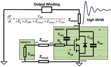 圖7解釋了讓柵極驅(qū)動器靠近功率MOSFET為什么如此有用。柵極驅(qū)動器的非零輸出阻抗ZDRV必須通過寄生阻抗Zstray1和Zstray2,以及柵極阻抗Rg來控制MOSFET,尤其是關(guān)斷。這時,漏極上的高dV/dt加上柵極路徑上的高阻抗,可能引起MOSFET的寄生導(dǎo)通。而利用極短的連線和功能強(qiáng)大的柵極驅(qū)動器,幾乎可以實現(xiàn)完美的開關(guān)。