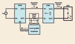 V•I芯片PRM整流器和VTM電壓變換器用來提供穩定的電壓。為了使用PRM和VTM給LED供電,需要修改PRM的工作方式以提供穩定的電流。這是通過采用電流放大器和補償器來實現的。