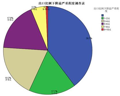 [page](二)出口下降最嚴重程度5-6成者比重最大,目前為止基本上已大部分恢復(fù)金融風(fēng)暴,全球經(jīng)濟重創(chuàng),對出口為主的企業(yè)影響最為慘重,尤其是對于以出口為導(dǎo)向的我國行業(yè)企業(yè),損失慘重。數(shù)據(jù)顯示,受金融危機影響,出口比例下降最嚴重程度5-6成者比重最大,占17.8%,下降1-2成者比例也不低,占17.1%(如下圖:出口比例下降最嚴重程度調(diào)查表。備注:藍色部分39.7%比例為單一內(nèi)銷型企業(yè))。