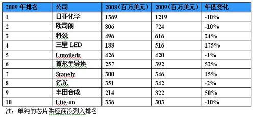以個別廠商營收觀察,較早切入大尺寸背光市場的LED供應商,營收都在金融 海嘯中逆勢成長,例如韓國SamsungLED、首爾半導體 、日本廠商豐田合成等廠商。在營收排名上,2009年日亞化仍居全球第1名。其次是OSRAMOpto.與CREE等傳統LED大廠,臺灣廠商光寶、億光也都入榜前10名。