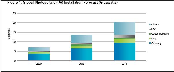 圖1所示為iSuppli公司對2009-2011年全球光伏裝機容量的預測。
