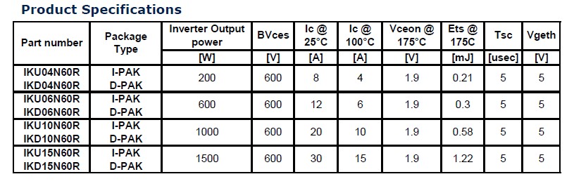 目前這種逆向導通型IGBT有兩種封裝形勢,一種是IPAK封裝,另外是DPAK封裝,電流有4安、6安、10安和15安四個等級。它主要的特點就是有非常低的價格,還有節省空間。半導體器件它的成本主要取決于兩個方面,一個是它的晶圓,減少晶圓的數量,從兩個晶圓減少到一個晶圓可以減少成本。另外的話,這種T0220的封裝還有這種D2PARK封裝可以減少成IPARK封裝和DPARK封裝,同時減少封裝的成本,減少了封裝的話同樣會減少它的空間,但是減少了晶圓的話會不會對它的性能造成影響?首先我們來看一下,同樣它有一個非常低的飽和導通壓降,對它的性能絲毫沒有任何影響。另外可以通過改變門級驅動電阻,在寬范圍調節它的開通和關斷的時間,有一個非常好的EMI效果,非常平滑的開關波形,5us的短路保護能力,最高結溫可以達到175度。這個是這種逆向導通型IGBT的主要參數,這個是它的擊穿電壓,這個是它的電流,這是175度飽和導通壓降,這是開關的能力,這是短路保護的能力,這是它的門級驅動電壓,基本上對于一個200W的產品可以選擇4安的IGBT,600W的話可以選擇一個6安的,1000W可以選擇一個10安的,1500W的可以選擇15W的產品。