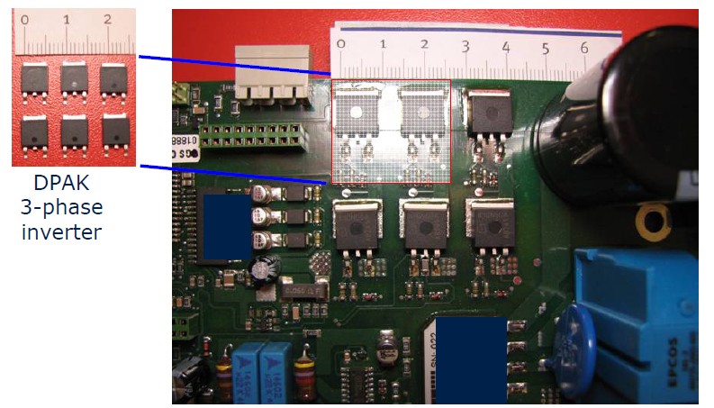這是一個實際的PCP板上的IGBT的圖,我們看到如果用D2PARK的話,它兩顆的面積大概在2.5厘米,而如果使用DPARK封裝的話可以減少到1.5厘米左右,同時它跟IGBT模塊來相比的話可以節省0.5個美金的成本,所以對于一些消費類市場低成本的產品這個相當重要的。