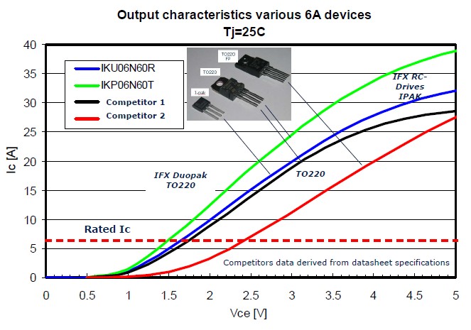 總結一下IGBT的重要特點,一個是成本,因為它采用的是一個晶圓,所以它的成本有很大的優勢;另外因為減少了它的封裝,可以給PCB留下更多的空間,進一步提高產品的功率密度。同時它也有一個非常好的性能,非常低的飽和導通壓降,一個非常軟的開關特性對EMI非常有幫助,它還有一個很好的溫度特性,最高溫度可以達到175度。藍色曲線是逆向導通型IGBT和目前TO220封裝的飽和導通壓降的比較。這是用一個6安的產品在做比較,當這個電流在6安的時候可以看到飽和導通壓降非常的低。