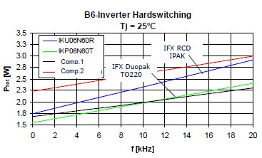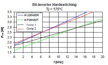 這個是25度損耗的時候,這個是175度損耗的時候,可以看到藍色的這根線,基本上它的損耗跟這個TO220封裝產品相差并不是很大。這個是在基于剛才基礎上做的一個損耗分析,首先頻率在4K赫茲的時候可以看到,這個淺藍色的就是二極管的開關損耗,這個是二極管的導通損耗,這個是IGBT的開關損耗,這個是IGBT的導通損耗。可以看到在4K的情況下導通損耗這一部分和這一部分是占了絕對支配地位的。所以對于一個低頻應用來說減少它的飽和導通壓降對于IGBT是相當的重要,當它的頻率升高的時候,它的開關損耗就會稍微升高一點。