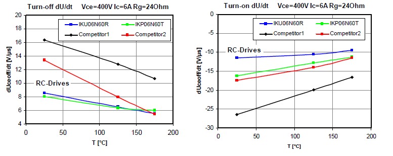 再加上不同的驅動電阻,這個時候我們也對dV/dt進行了一個測試,然后可以看到基本上我們的dV/dt都比我們的競爭對手或者市面上的產品會優異很多。因為減少IGBT的dV/dt的話可以減少前級的EMI濾波器的要求,同樣也可以減少成本,所以這個產品不僅在本身的價格上面有優勢,同樣也可以整體的減少系統的成本。