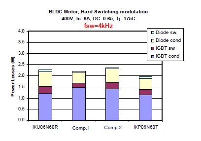 衡量一個IGBT的好壞有兩個非常重要的指標,一個就是它的飽和導通壓降,就是Vce(sat),另外一個就是開關損耗,也就是Eoff。對于低頻的應用來說,飽和導通壓降是占有絕對支配地位的,所以選擇這種RC-Drives的IGBT會是一個非常好的選擇,因為可以看到這種RC-Drives IGBT的飽和導通壓降是遠遠低于市面上的一些產品。這個是在一個無刷電機上面的損耗的分析。