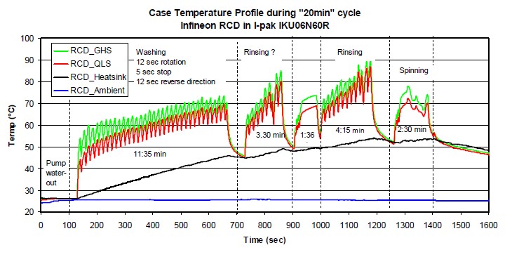 下面就是為了驗證這種逆向導通型IGBT在實際應用當中的一個表現,我們在一個洗衣機上面驗證了6安的IPARK的產品,在一個風機上面我們驗證了6安的DPARK的產品。這是一個實際的洗衣機的控制板,這種方式就是采用了夾子,然后把這個IGBT夾在散熱器上面。稍候我們會用這種IPARK的封裝對這種TO220的封裝做一些替代,然后比較一下他們的不同。就是說我們把其中的一路替代成IPARK產品,然后做一個效率還有溫度的檢測,通過這種熱電偶的方式來檢測它的表面溫度,來檢測它的結溫。因為它外面有一個夾子,我們沒有辦法用紅外相機來檢測它的溫度,所以我們采用了這種熱電偶的方式。這個是洗衣機的工作流程,首先的話是抽水,這個是洗滌,這個是漂洗,這個是甩干,整個20分鐘的流程當中它的溫度的表現,基本上它的最高溫度沒有超過90度,我們可以看到這個綠色和紅色有一點稍微小小的區別,這是因為它的散熱不一樣,IGBT的位置放在不一樣,所以會有一點不一樣,這個不用太過擔心。