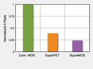 在需要最低RDS(on)與快速切換的應用中,新的平衡型器件,例如SupreMOS與SuperFET,可提供最大的優勢。一般而言,SuperFET器件在RDS(on)要求為0.5~1Ω之時優勢最大。而SuperMOS在RDS(on)低于0.5Ω時優勢明顯。這一差異又是由于熱阻的作用。