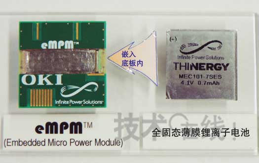 不僅是電容器及IC,就連電池也開始內置在印刷底板中。沖Printed Circuits試制出了內置薄型全固態鋰離子充電電池的4層印刷底板,并在2010年6月舉辦的安裝技術國際展會“JPCA Show 2010”上進行了參考展示。“已開始與多家設備廠商討論使用方法,希望最早于2011年啟動業務”(沖Printed Circuits技術本部商品開發部擔當部長中澤哲夫)。
