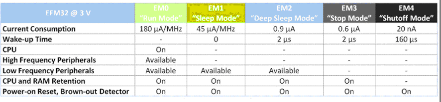 圖3. EFM32 Gecko微控制器的一個關鍵屬性是它提供給用戶的能源模式選擇,例如,在完整的關閉模式中電流消耗僅有20nA,而在深度睡眠模式(保持通電復位、燈光暗淡檢測器、實時時鐘,并保留RAM內容和CPU狀態)下僅有900nA。
