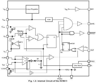 HV9911為CloseLoop,PeakCurrentControl,SwitchingModeLED驅動電源控制IC,它內建了許多功能來客服升壓電路的缺點。HV9911包含了9-250VDC輸入電壓穩壓器,不需額外電源,僅由單一輸入電壓提供IC動作的工作電源。它內建了2%精密的參考電壓(全溫度范圍)能精確地控制LED串聯電流。并且包含了斷路用的FET驅動電路。當輸出短路或過電壓時,便會自動斷開LED串之對地路徑。此功能縮短了控制電路的反應時間(請參考PWM調光電路說明)。(圖3)