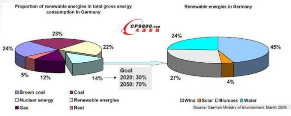 歐洲是現代能源和氣候政策的先驅,德國是利用新能源技術方面一個最好的例證。鑒于到2020年,要實現減少14%的二氧化碳排放量(與2005年的排放量相比)的目標,到2020年可再生能源在初級能源消耗中的比例要增加到18%(2005年為6%)。對于德國總電力消費來說,這意味著到2020年可再生能源的份額將增加一倍,如圖2所示。展望未來,到2050年計劃可再生能源的份額達到70%。