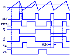 SG3525芯片各點的工作波形如圖3所示,由誤差放大器輸出的電壓Ve與鋸齒波的交點可得一負的PWM信號。由PWM信號、時鐘信號及分相器輸出的Q(或)信號,根據或非門的邏輯可得兩個或非門的輸出信號Va和Vb。由波形圖可以看出,PWM比較器的反相輸入端電平越高,輸出脈沖Va和Vb的占空比越大;反之越小。根據這一規律來實現該控制器的調壓、軟啟動及保護功能。另外,可以通過改變5腳和7腳之間的外接電阻的大小,使時鐘脈沖寬度變化來實現死區大小的調節。