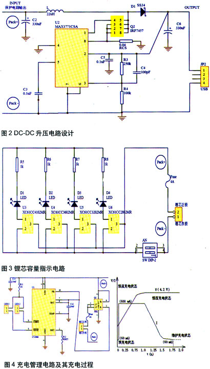 本文論述的電路系統(tǒng)設(shè)計(jì)由五部分組成:鋰芯容量指示電路、電芯保護(hù)電路、充電管理電路、DC-DC升壓電路和功能擴(kuò)展電路。鋰芯容量指示電路由XC61CC系列的電壓監(jiān)控芯片組成。電芯保護(hù)電路由過充保護(hù)、過放保護(hù)、過溫保護(hù)三部分組成,HAT2027、R5402、自恢復(fù)保險(xiǎn)絲構(gòu)建了三重保護(hù),使鋰芯安全性大大增強(qiáng)。充電管理電路采用了CN3066,將充電過程分為涓流充電、恒流充電、恒壓充電和維護(hù)充電四個(gè)部分,使移動(dòng)隨身電源能夠最大程度地儲備能量。DC-DC升壓電路采用了MAX1771集成芯片,可將鋰芯容量在安全范圍內(nèi)最大限度釋放,達(dá)到對多種數(shù)碼設(shè)備供電的目的。功能擴(kuò)展涵蓋了戶外活動(dòng)所涉及的常見需求,具有應(yīng)急夜間高亮照、戶外防盜安全警報(bào)、野營驅(qū)蚊等功能。