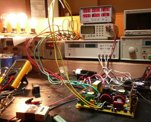 這里,可以稍稍為前級加點負載,可以用二個100W220V的燈泡串聯起來,接到高壓解的二端,這時電瓶電流可達到12A左右,讓它工作一段時間,看看前級功率管有沒有溫升,如果溫升不明顯,可以把電瓶保險絲換大點,繼續加大負載,一般在功率管散熱正常的情況下,前級可以加到600W左右。在加載的情況下,再看D極波形,應該是正常的方波,稍有點尖峰是沒有關系的,如果尖峰過大,說明變壓器制作不過關,要重新繞制。