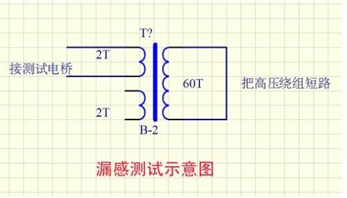 我發現用這種方法繞制的變壓器漏感比較小。以前用銅帶繞制,漏感一般在0.8uH以上,現在可以做到0.4uH以下。我想原因是:因為銅帶要焊引出線頭,這樣就留下了一個錫堆,再繞高壓繞組時,中間就有一個空隙,導致耦合不緊。下圖為測試漏感示意圖。