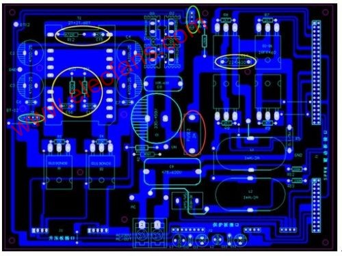 前級推挽部分的供電采用對稱平衡方式,這樣做有二個好處,一是可以保證大電流時的二個功率管工作狀態的對稱性,保證不會出現單邊發熱現象;二是可以減少PCB反面堆錫層的電流密度,當然,也可以大大減小因為電流不平衡引起的干擾。高壓整流快速二極管,用的是TO220封裝的RHRP8120,這種管子可靠性很好,我用的是二手管,才1元錢一個。高壓濾波電容是470uf/450V的,在可能的情況下,盡可能用的容量大一些,對改善高壓部分的負載特性和減少干擾都有好處。H橋部分用的是4個IRFP460,耐壓500V,最大電流20A,也可以用性能差不多的管子代替,用內阻小的管子可以提高整機的逆變效率。H橋部分的電路采用的常規電路。