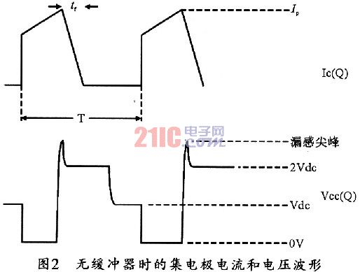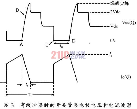 當開關(guān)管帶緩沖電路時,其集電極電壓和電流波形如圖3所示(以正激變換器為例)。