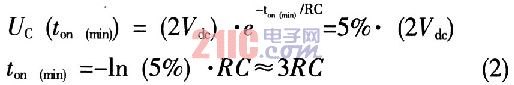 因此,從式(1)和式(3)便能計算出電容C的大小。在確定了C后,而最小導通時間已知,這樣,通過式(2)就可以得到電阻R的大小。