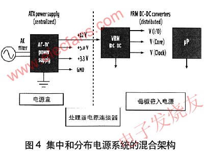可以用集中和分布單元的組合設計電源系統,如圖4所示的混合電源系統。集中電源產生5.0V和3.3V邏輯電源(其輸入為ac線)以及分布到電壓穩壓器模塊(VRM)的12Vdc電平。用VRM為高性能處理器提供很大電流、低電壓芯核和I/O電壓。VRM電源變換器放置在母板靠近處理器的“負載點”處,這可減少電路板跡線電壓降,在不同的情況下,跡線電壓降對于有效的變換器工作是不能接受的。