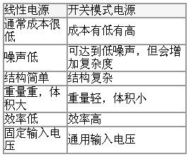 與傳統的線性電源相比,開關電源具有許多優點。在通常情況下,如果只需要一個直流輸出,采用一個變壓器、整流器和濾波電容就可構成線性電源。有時,可采用一個線性穩壓器提供穩壓輸出。這種系統的主要優點是簡單,所以成本通常較低。而開關電源通常結構復雜、價格昂貴,所以線性電源獲得了廣泛應用。表1列出了兩種系統的優點和缺點。