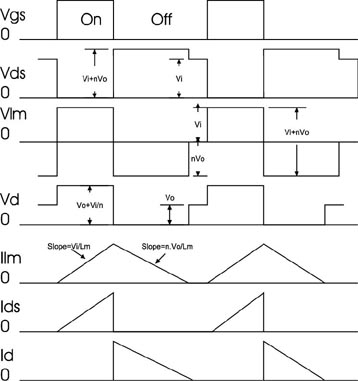 [page]當開關閉合時,電壓施加在變壓器初級的兩端,因為此時次級二極管是截止的,變壓器所起的作用就像電感器。經過初級線圈的電流會上升,同時能量儲存在磁通量中。當開關斷開時,次級二極管導通,電流通過次級時會下降,因為能量被轉換至次邊大容量電容器。如果電流經過磁化電感區后降至零,這是不連續導通模式。如果磁化電流未降至零,如圖3所示,則系統以連續導通模式工作。